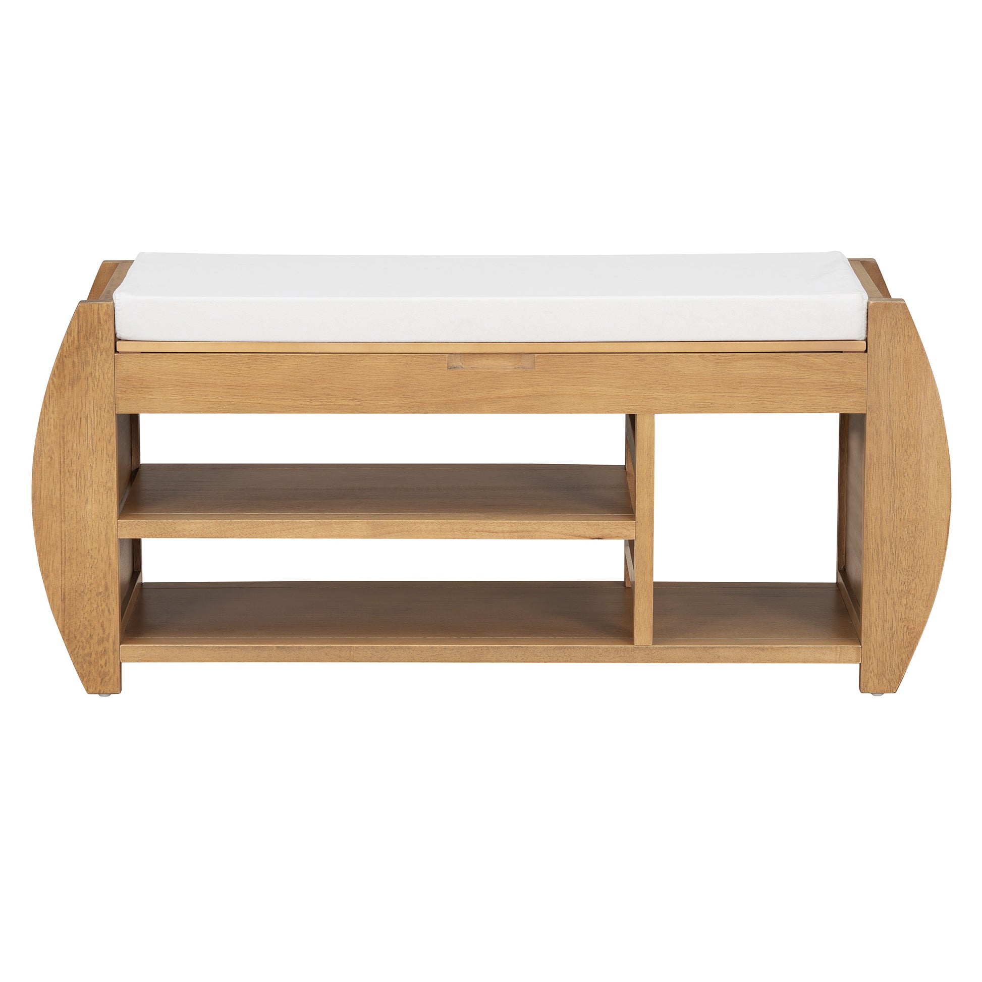 - Ample Storage: This storage bench offers versatile storage solutions. The open shelving provides space for shoes or decorative items, while the top lifts to reveal hidden storage for blankets or other essentials. Each one features a matching cushioned seat, adding both style and comfort to your space. The curved side panels and open shelving not only add visual interest but also enhance its practicality.
