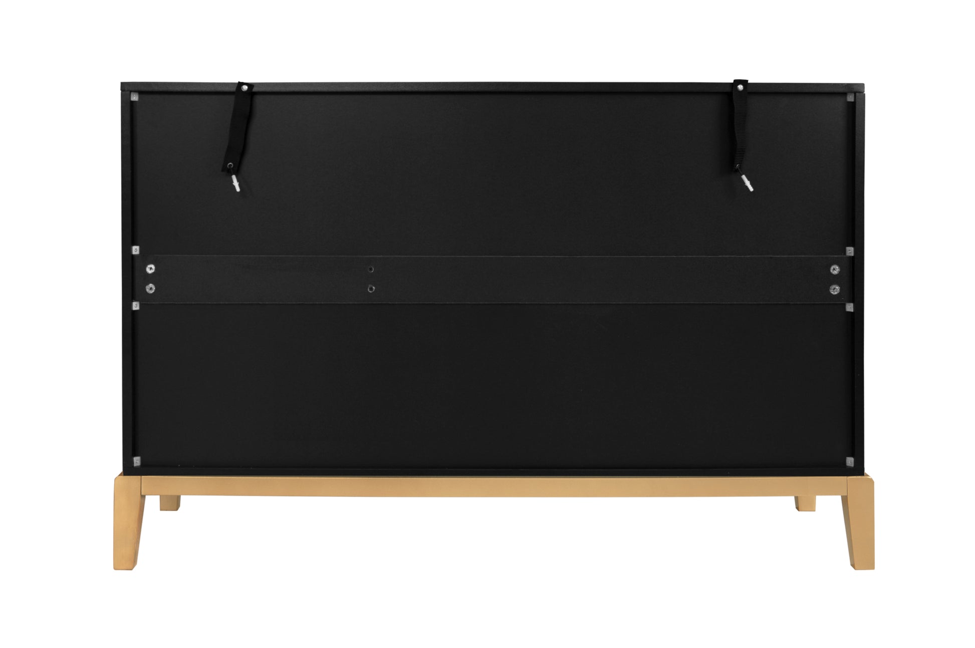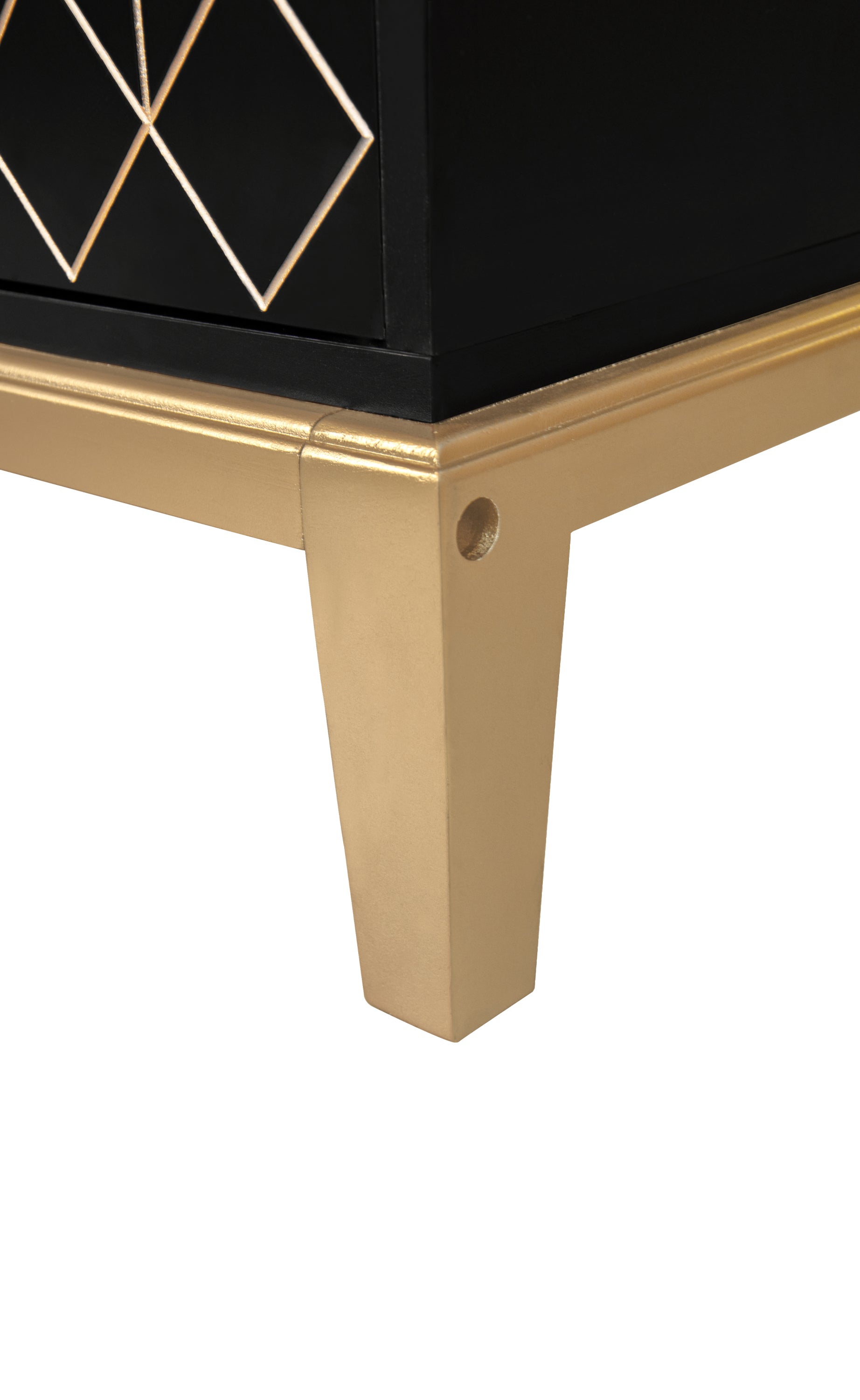 - The thickened, full-frame base features a painted finish that echoes the handles and gold lines for added cabinet stability.