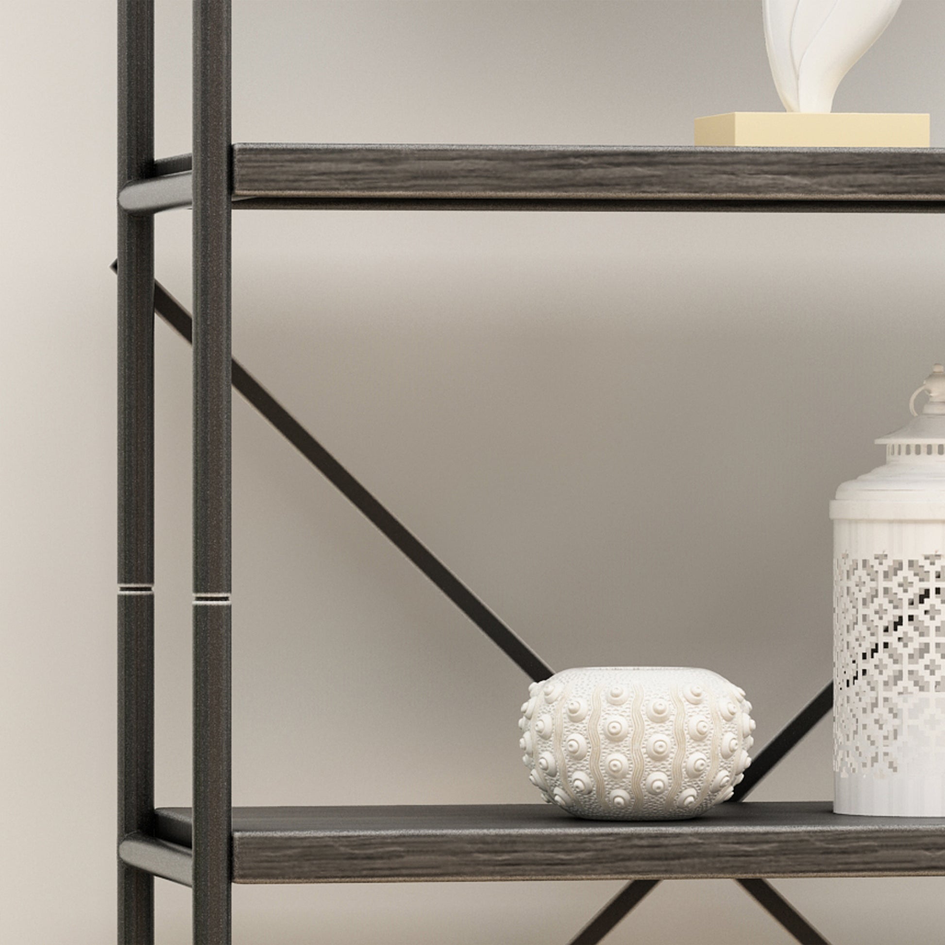 - Showcase a set of pictures or display your favorite potted plants with a raw and edgy style. Featuring an industrial design, our bookcase uses metal piping for an exposed yet sleek look. The metal piping also creates a highly durable structure that is fortified with an X-frame stretcher to ensure the best stability for your home.