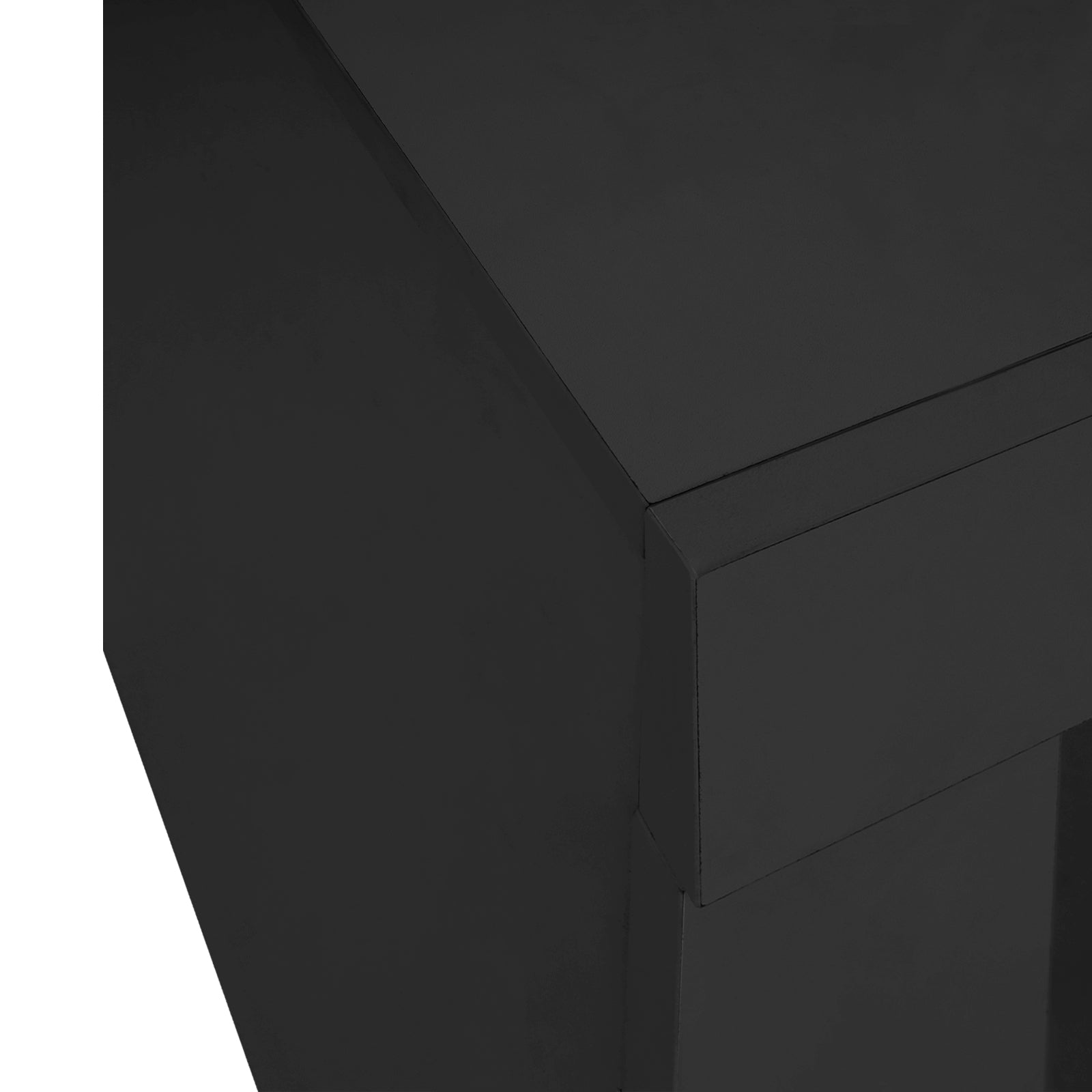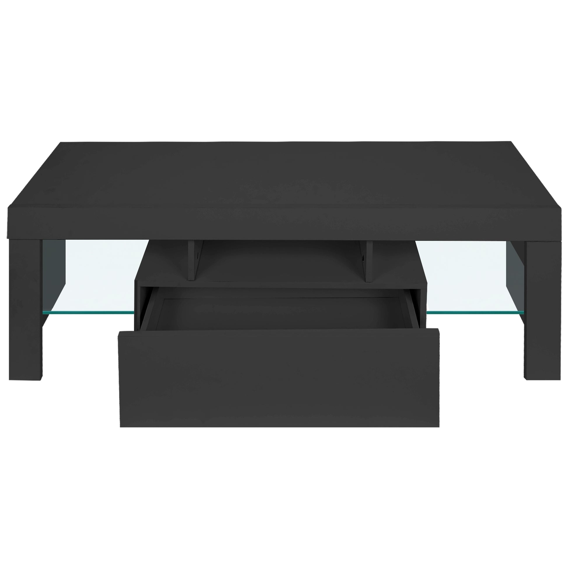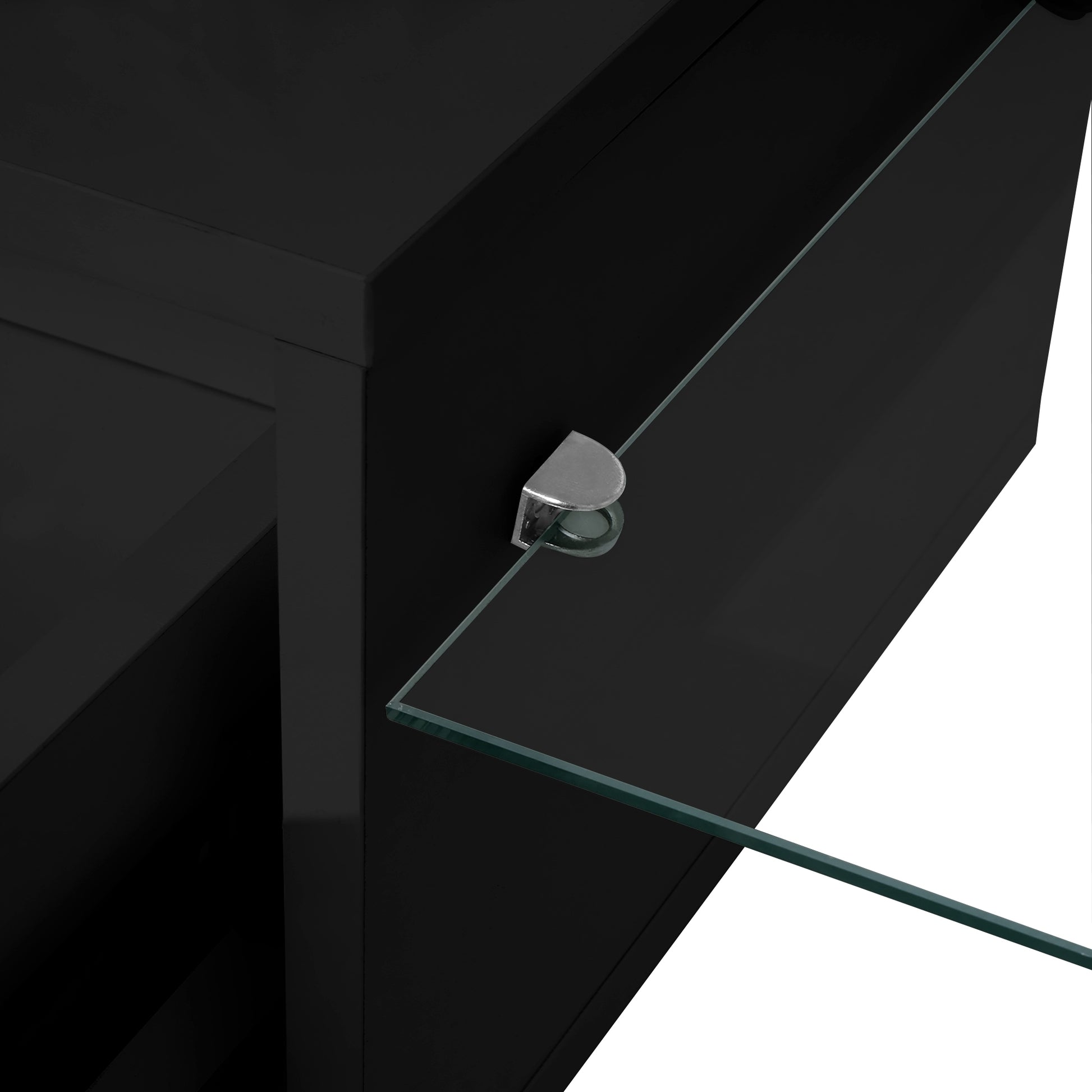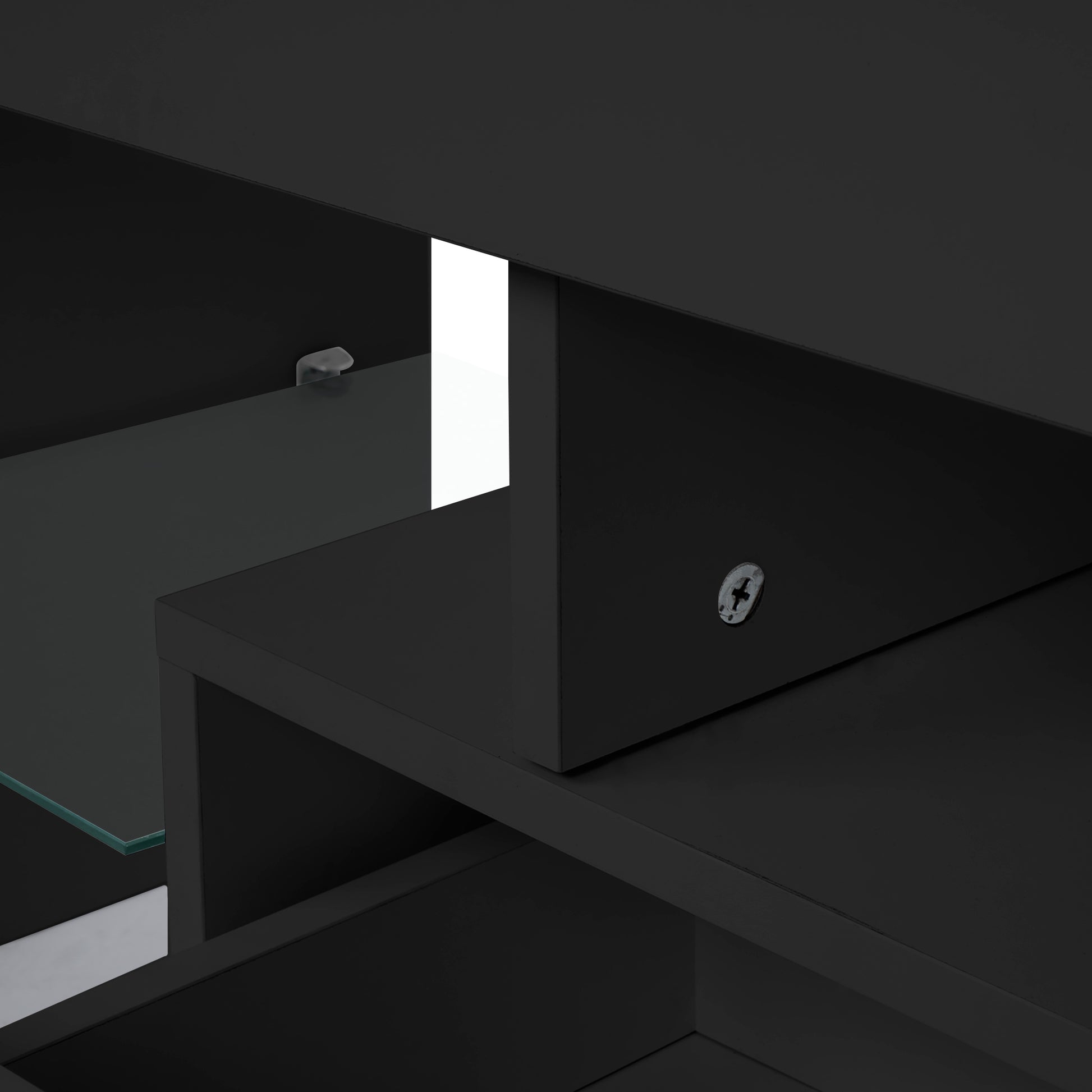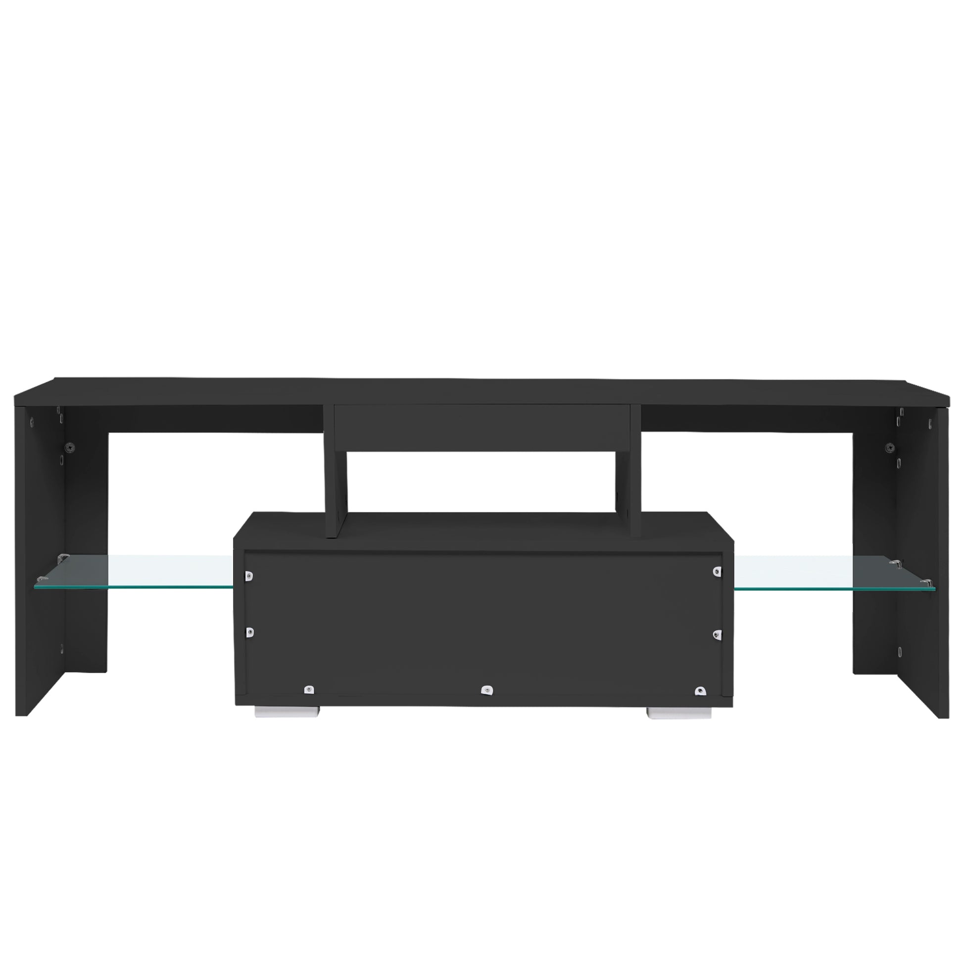 - [Strong Construction] The modern TV table is made of high glossy E1 grade particleboard and 4mm tempered glass shelf, sturdy and durable, has no wear or scratch. Drawers with padded hinges reduce noise when closing, allows a long-term of use.