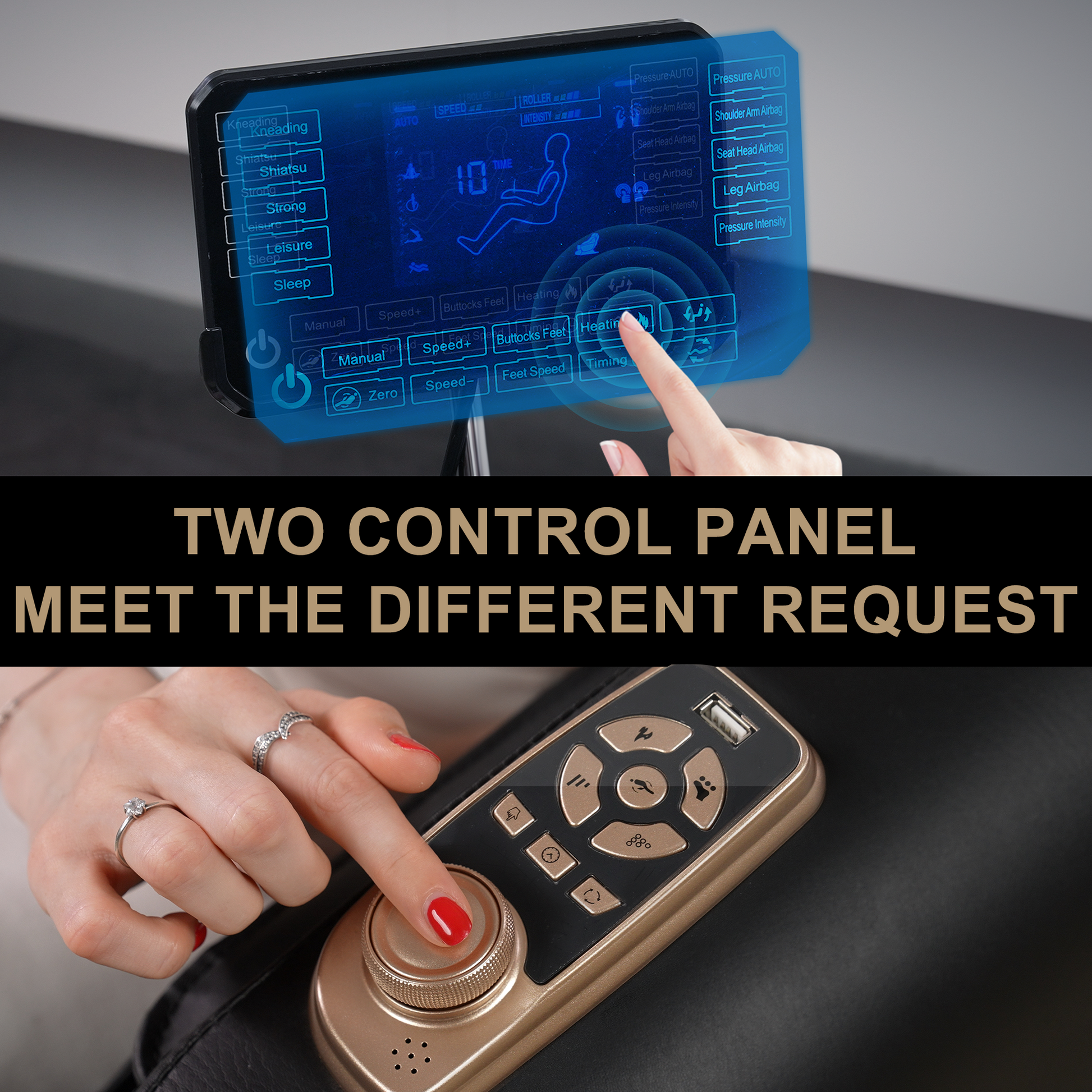 - Two Control Panel: Smart large screen & Rotary switch,meet the different request.It smoothly and securely controls the rise and fall without leaving the massage recliner,staying in your recliner and massage chair,Help you relax better in the massage chair.