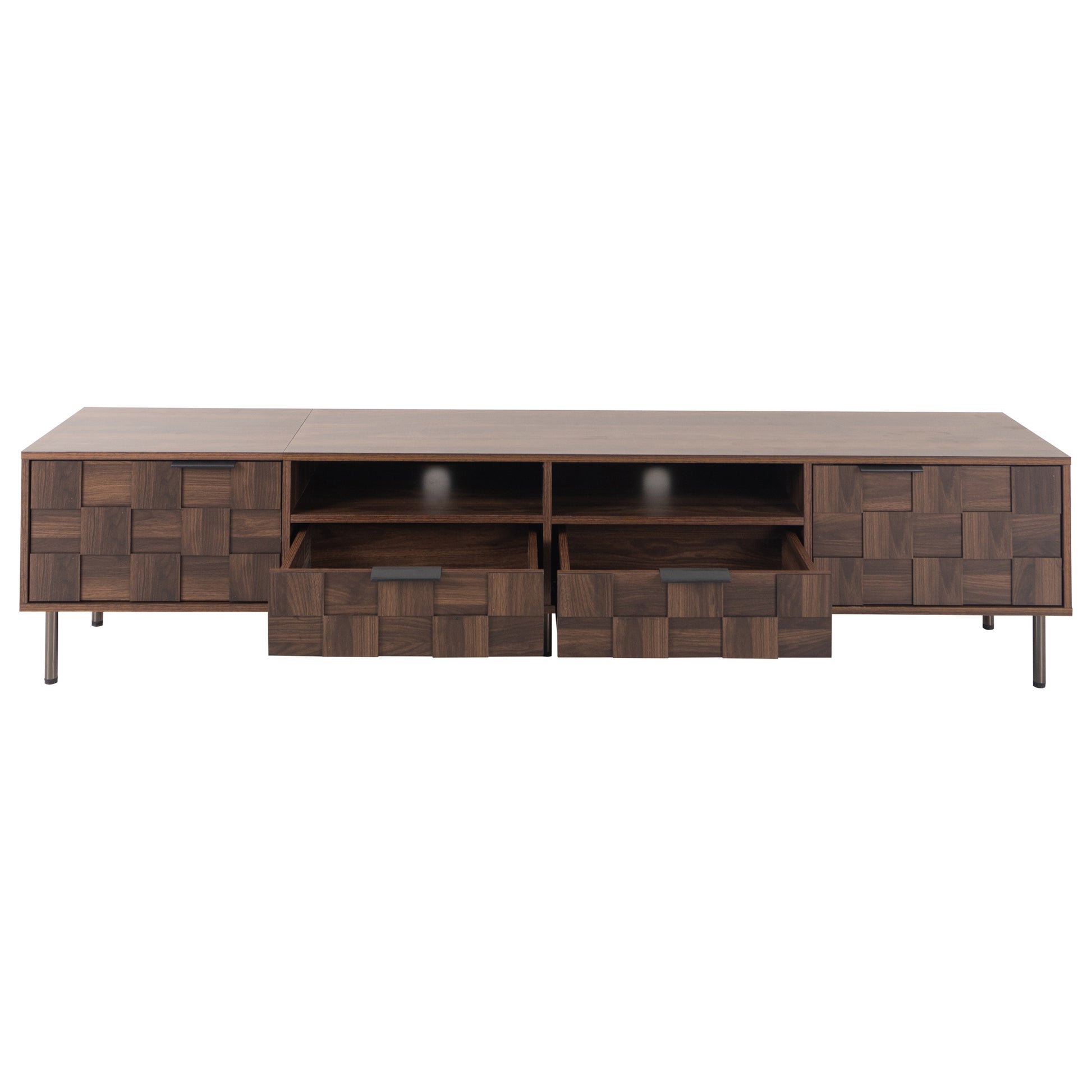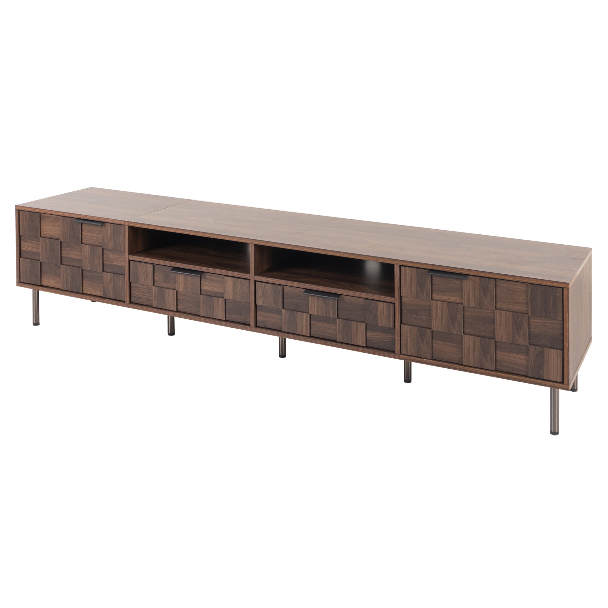 This TV cabinet is equipped with two drawers and four storage cabinets. The two closed cabinets can store seldom-used items to keep the space neat and tidy, while the two open cabinets can display your favorite ornaments or books, adding a sense of layering and visual beauty to the space.