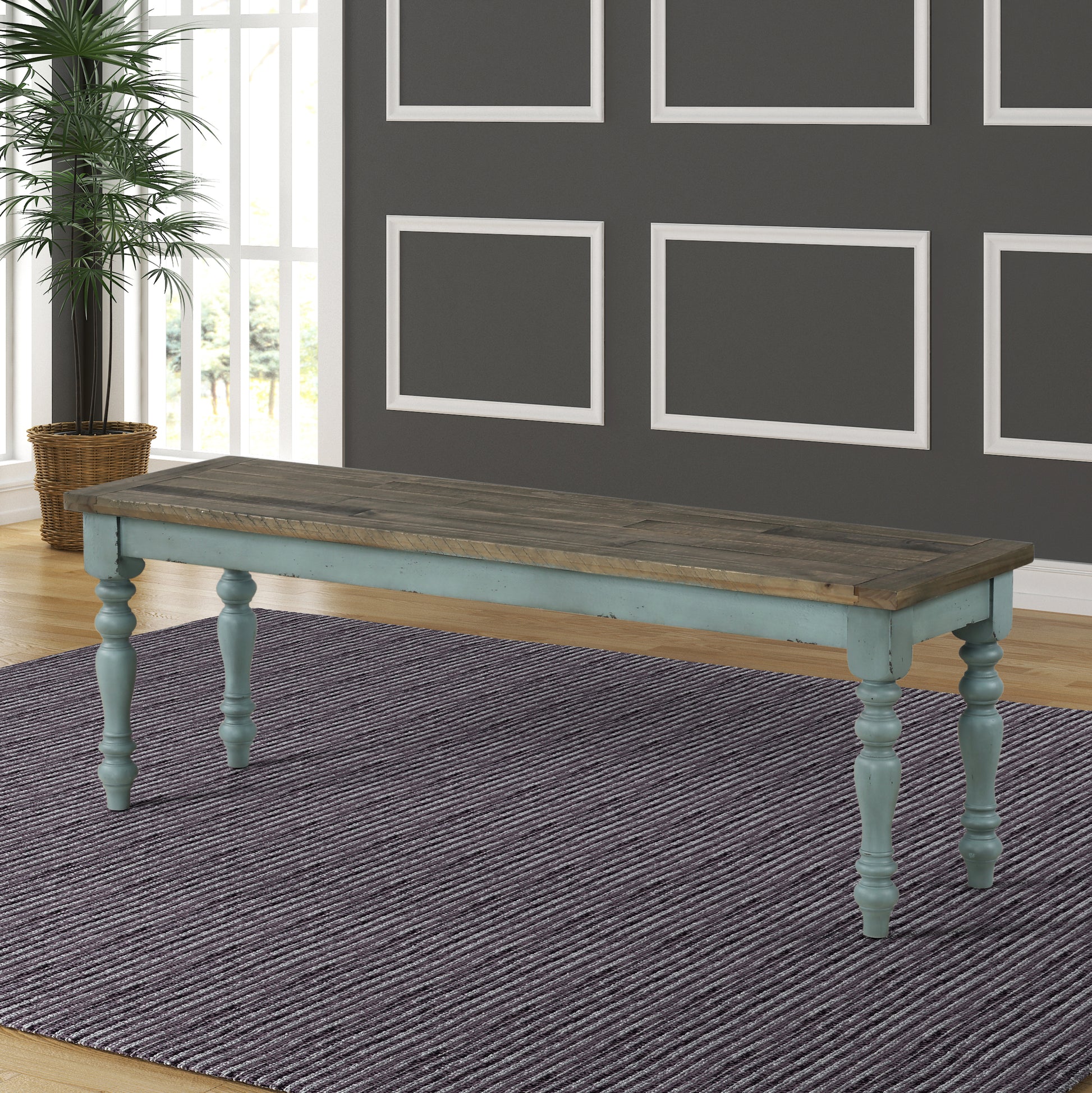 - The bench is made of solid rubberwood, featuring turned legs