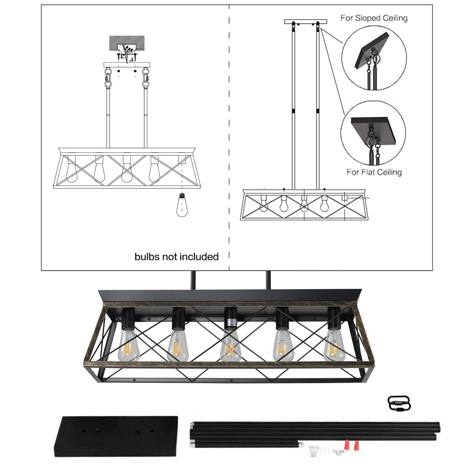 Industrial lighting: classically designed decorative metal frames display a unique look that complements the decor of your room, which is perfect for providing lighting in your kitchen or dining room. The size of chandelier is 31.5′ long × 10.2′ wide × 9.1′ high, and the height of suspender can be adjusted at will. Bulb Requirements: maximum 5X60W, E26 base (excluding bulbs) , compatible with LED, incandescent, cfls and halogen lamps. Perfect Decor: farmhouse dining room lamps are great for any dining room, foyer, kitchen, or farmhouse. The unique decorative design of dining lamps will be a good choice for these spaces.
