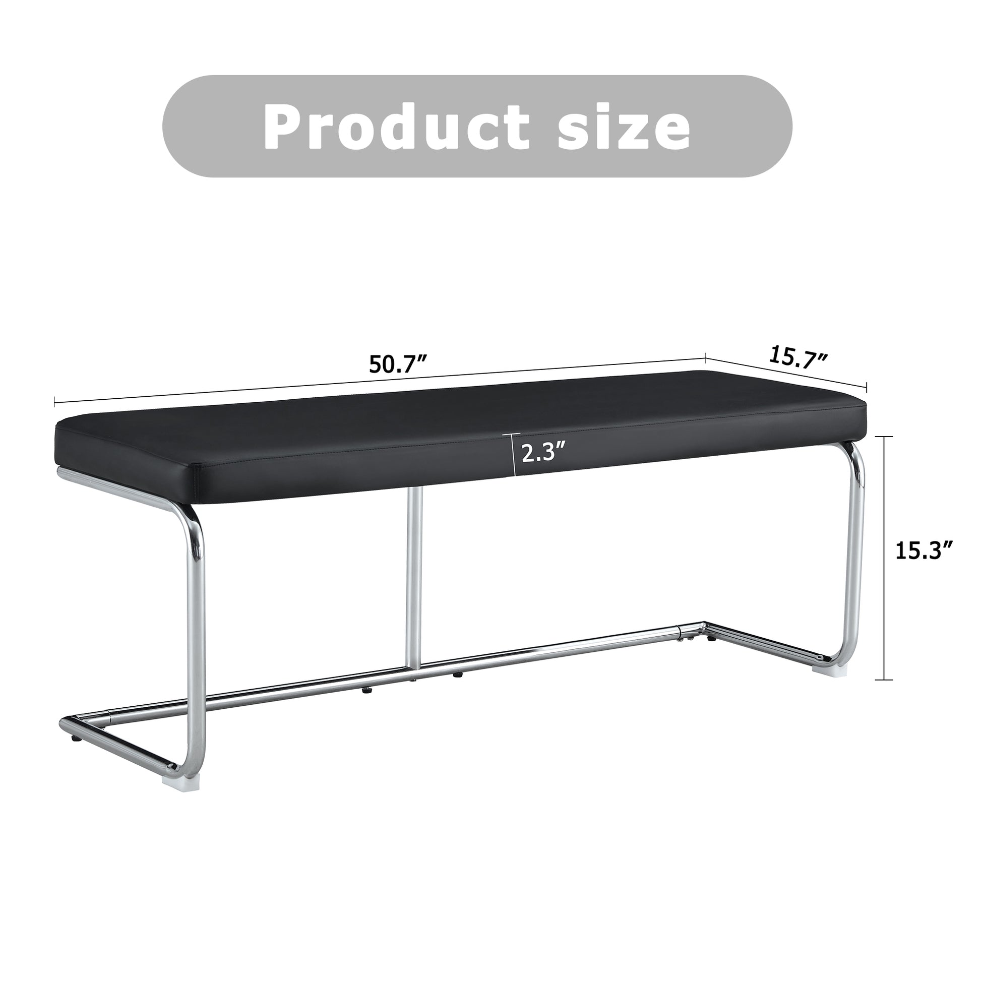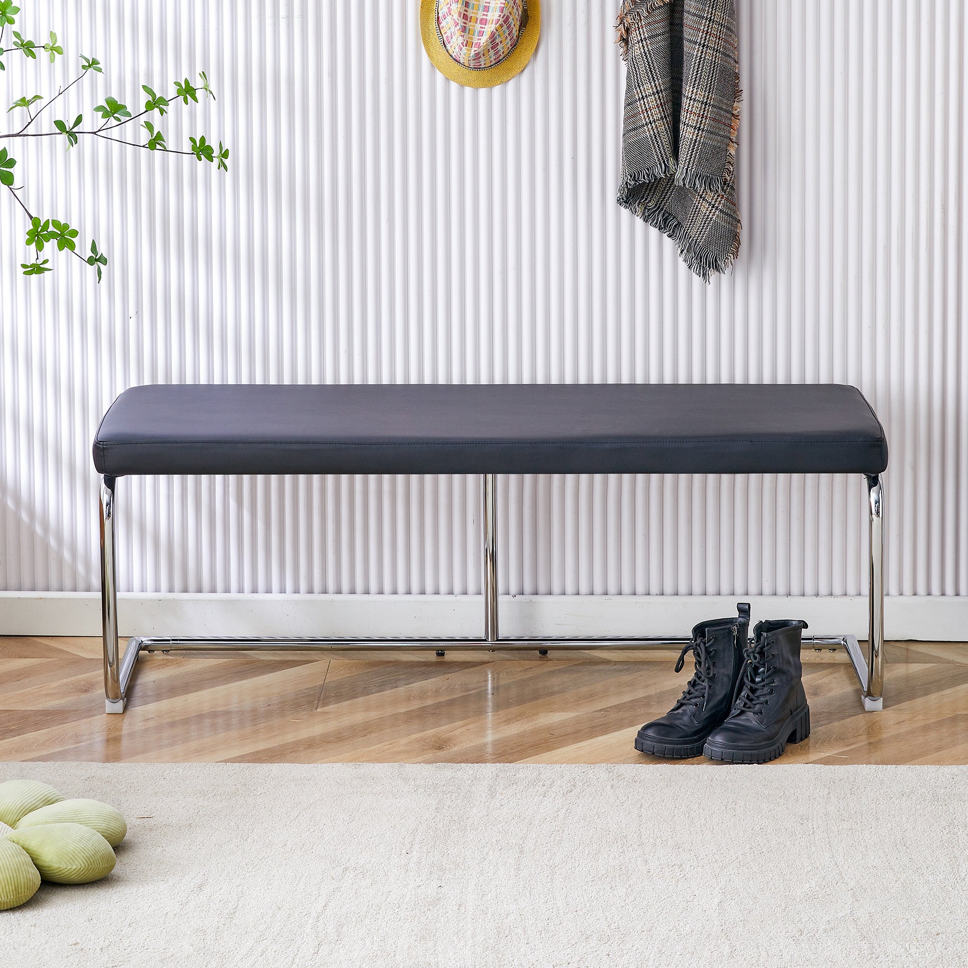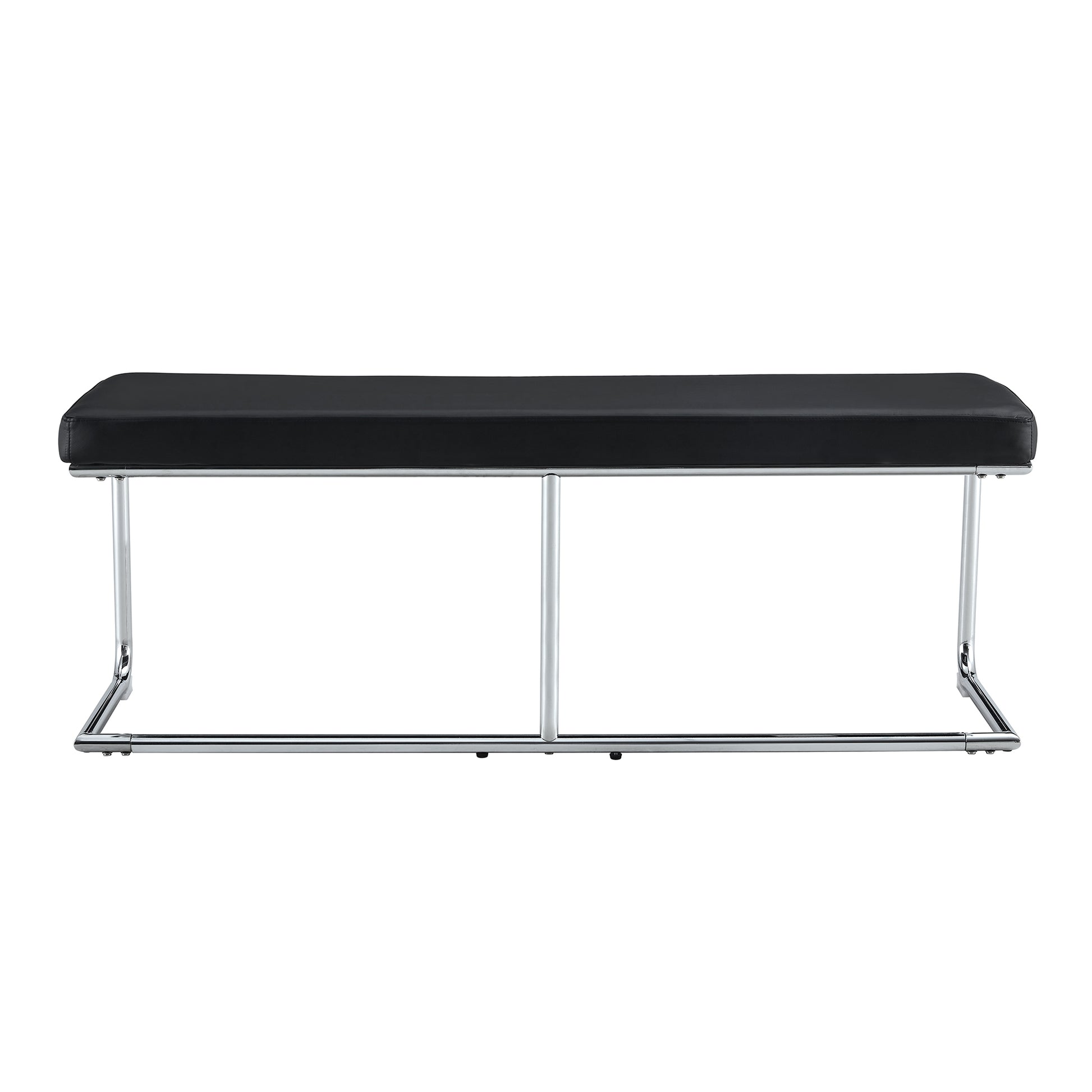 - Black leather bench, silver metal legs.