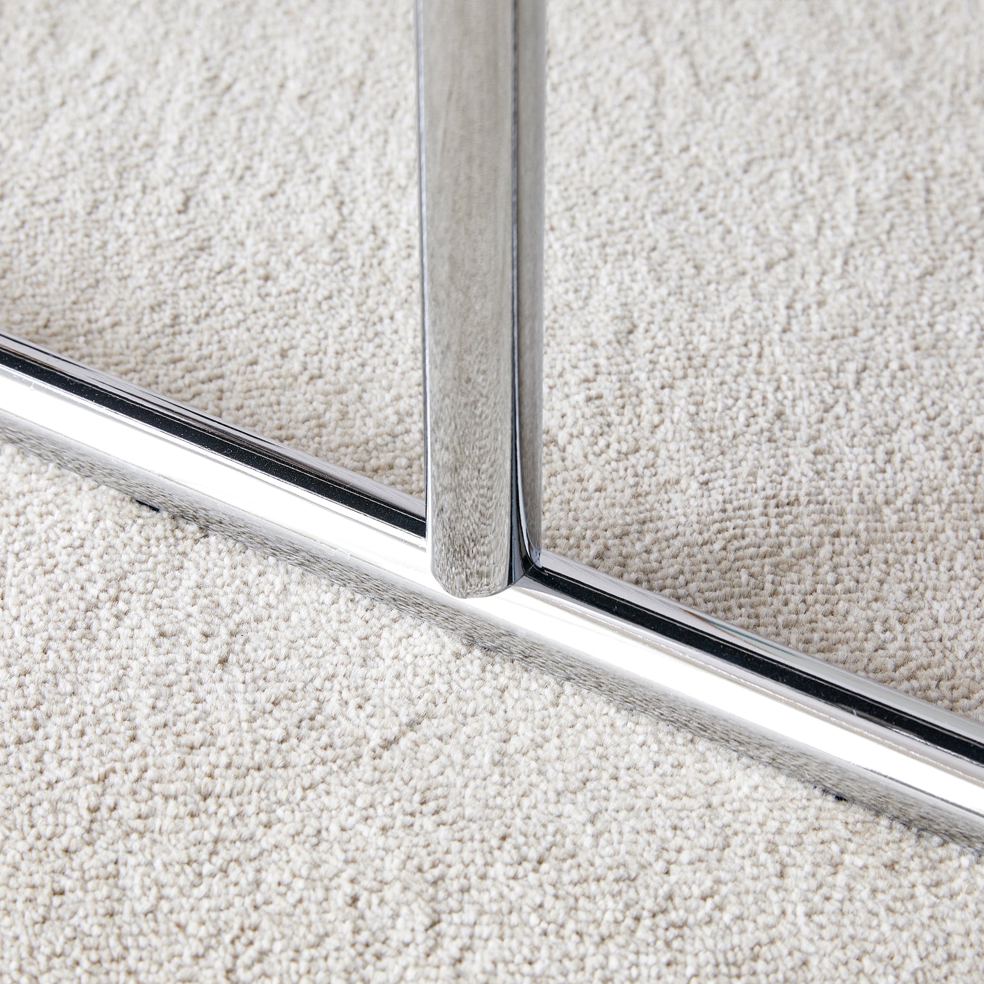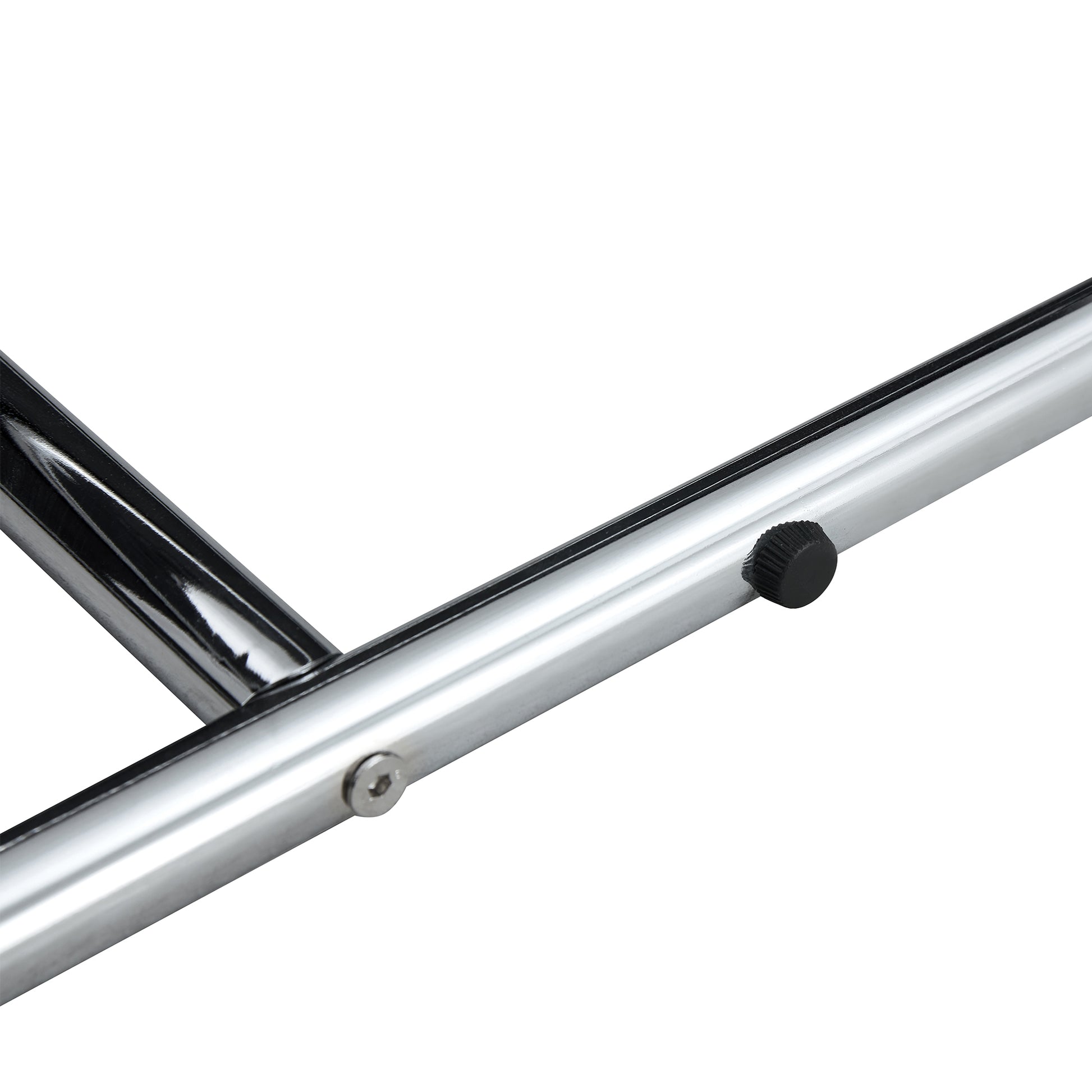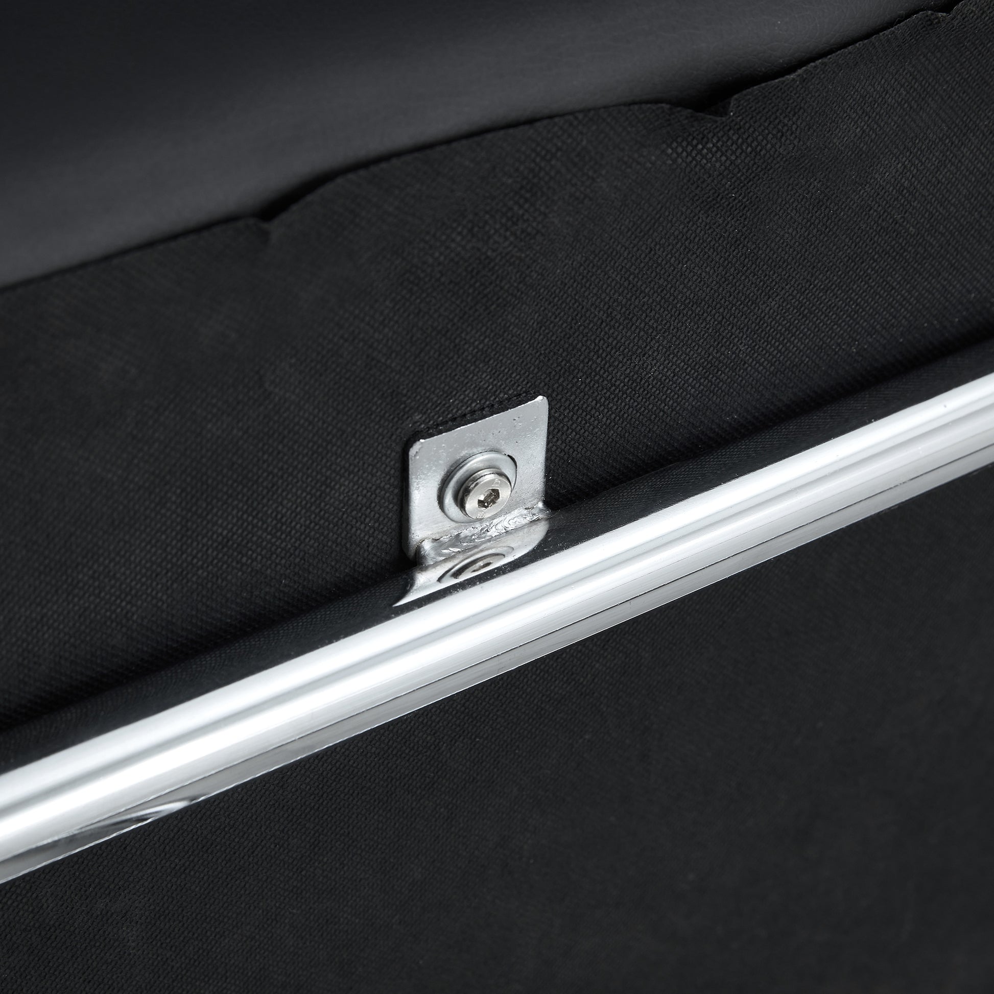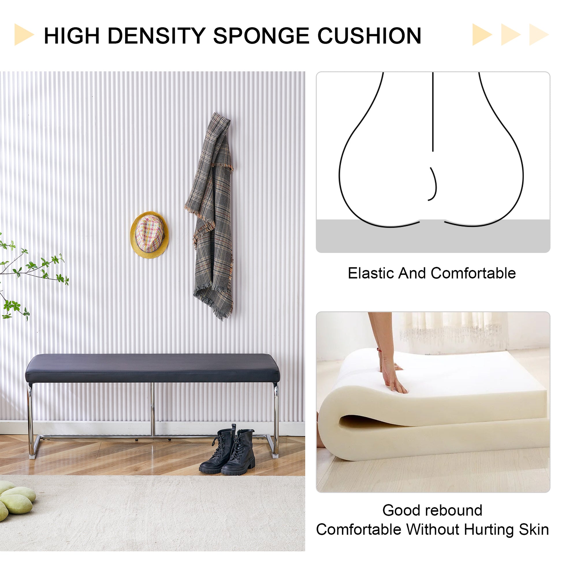- Black leather bench, silver metal legs.
