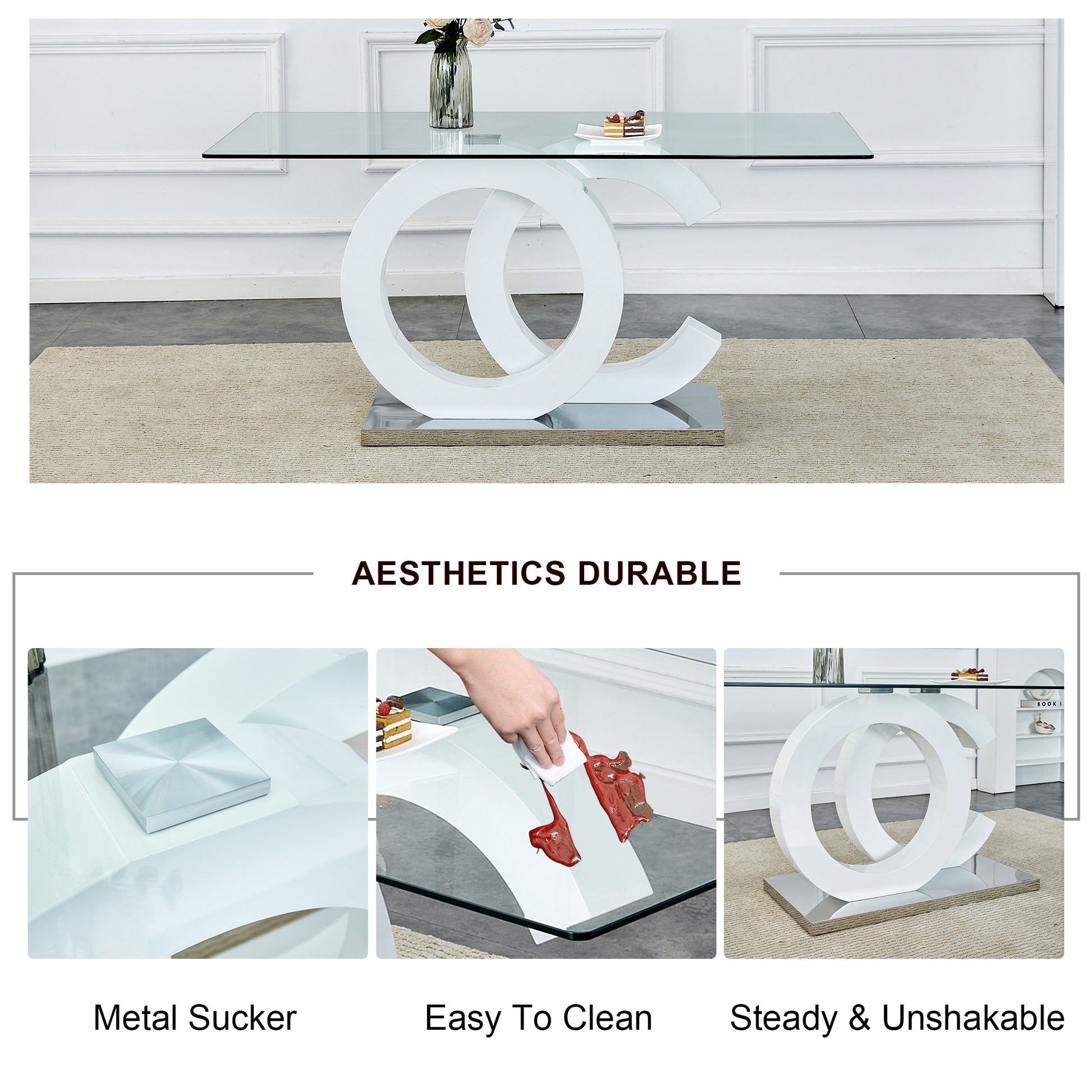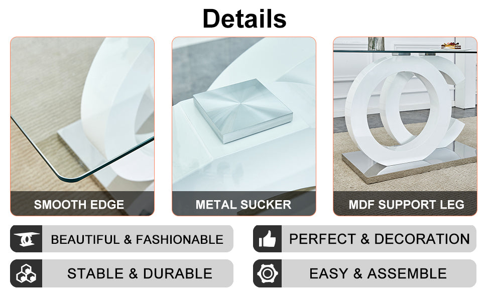 - Clear Tempered Glass Top: Offers a transparent visual effect, enhancing the sense of space, while providing the safety and durability of tempered glass.Unique OC-Shaped Design: The legs are made of white MDF with an OC-shaped design that is not only stable but also features a distinctive modern aesthetic.