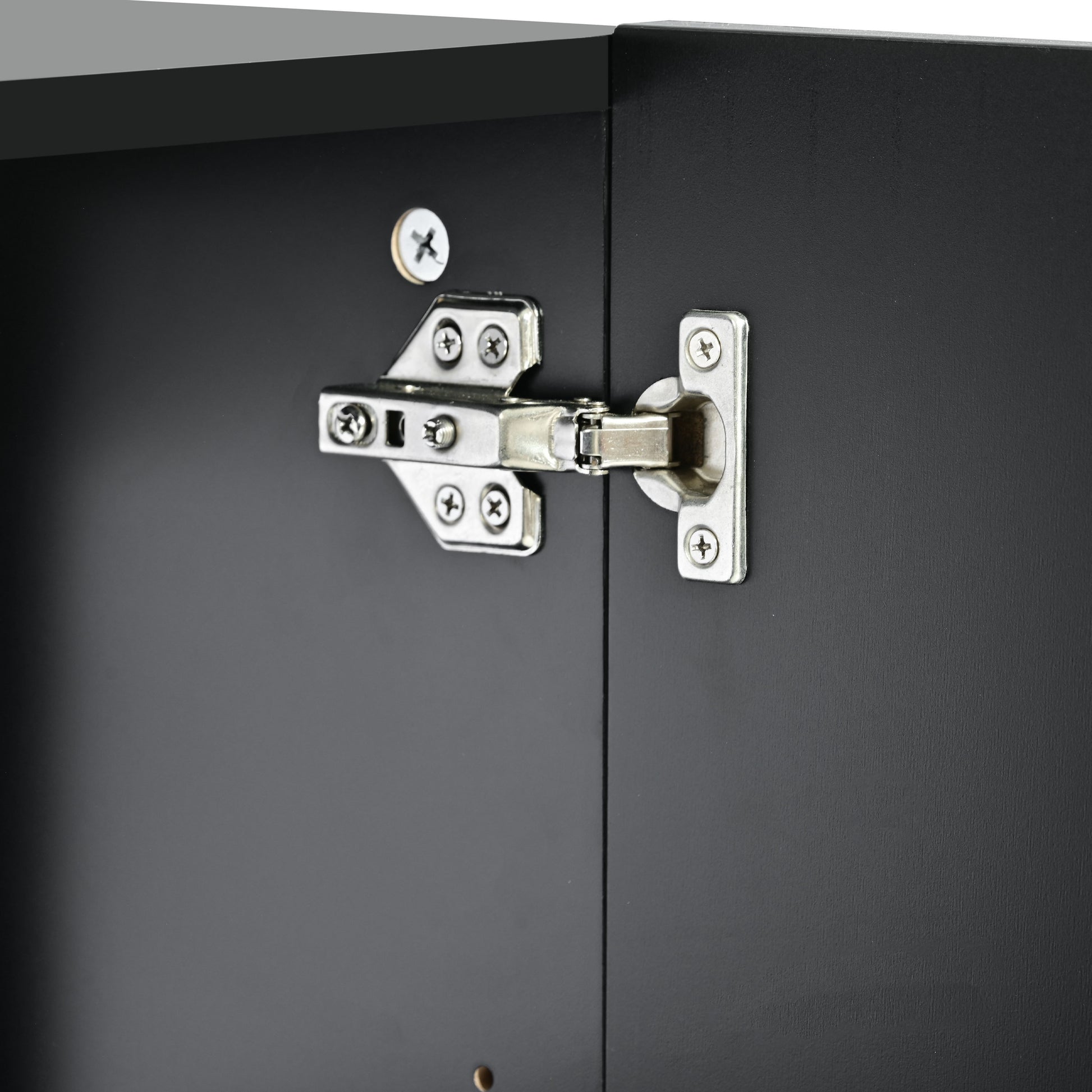 - The sideboard body is made of particleboard, and the tabletop is made of high-quality MDF, which has good load-bearing capacity. Desktop load capacity: 165 lbs. The doors, tabletop and side panels have been painted for a smoother finish. Other panels' surfaces are covered with stickers. The sturdy metal legs ensure good support and stability.