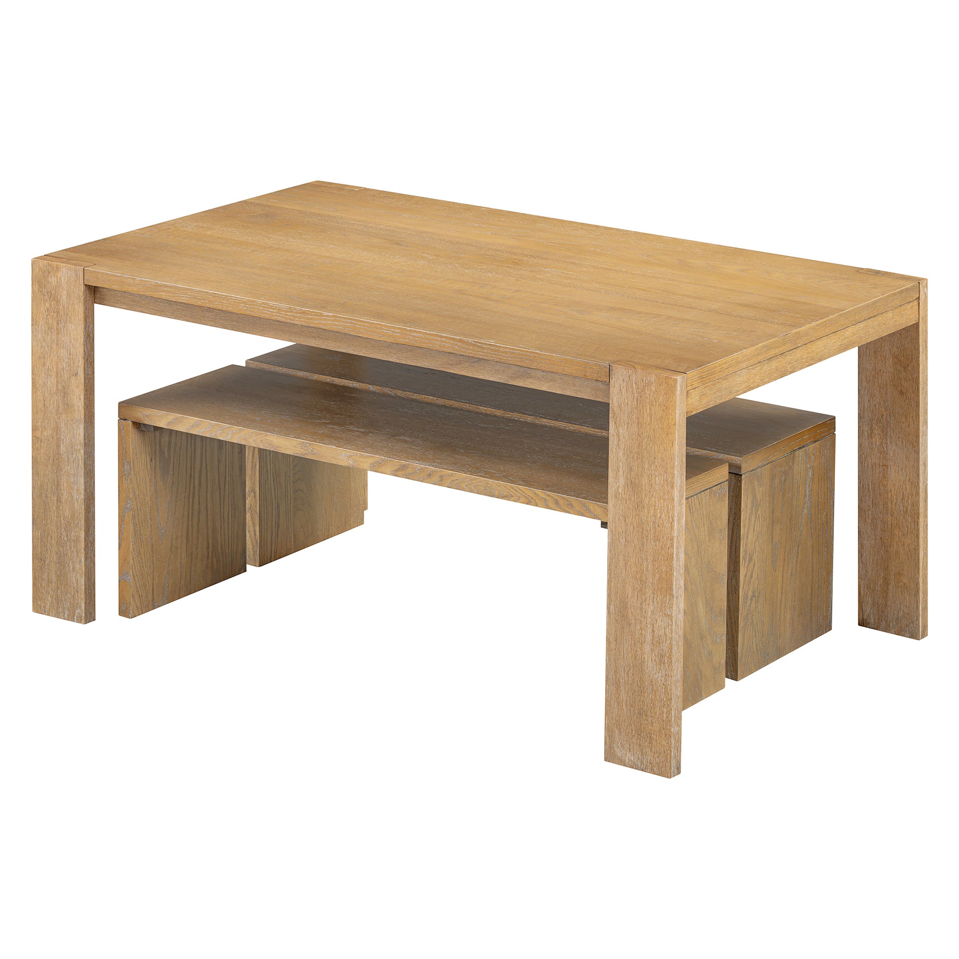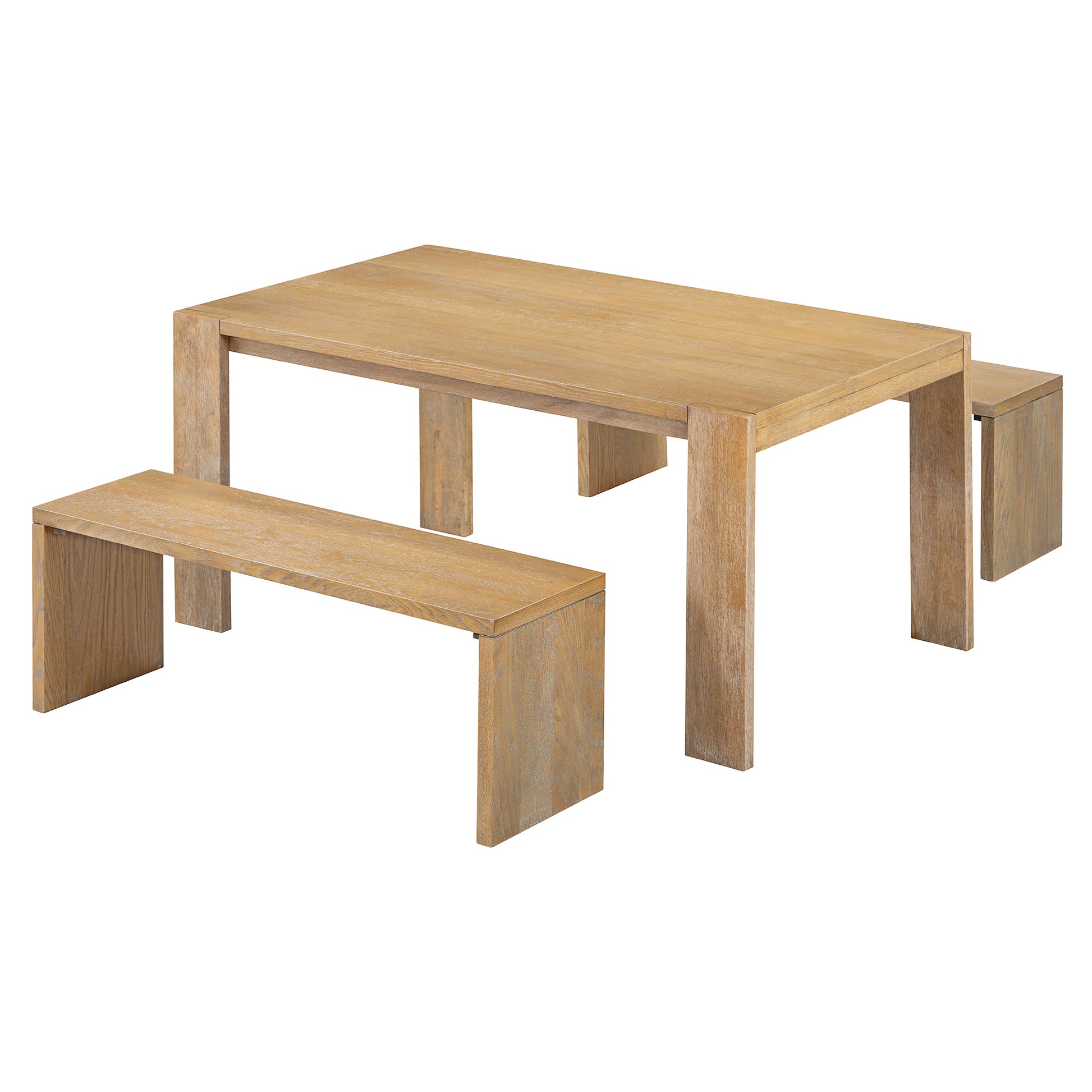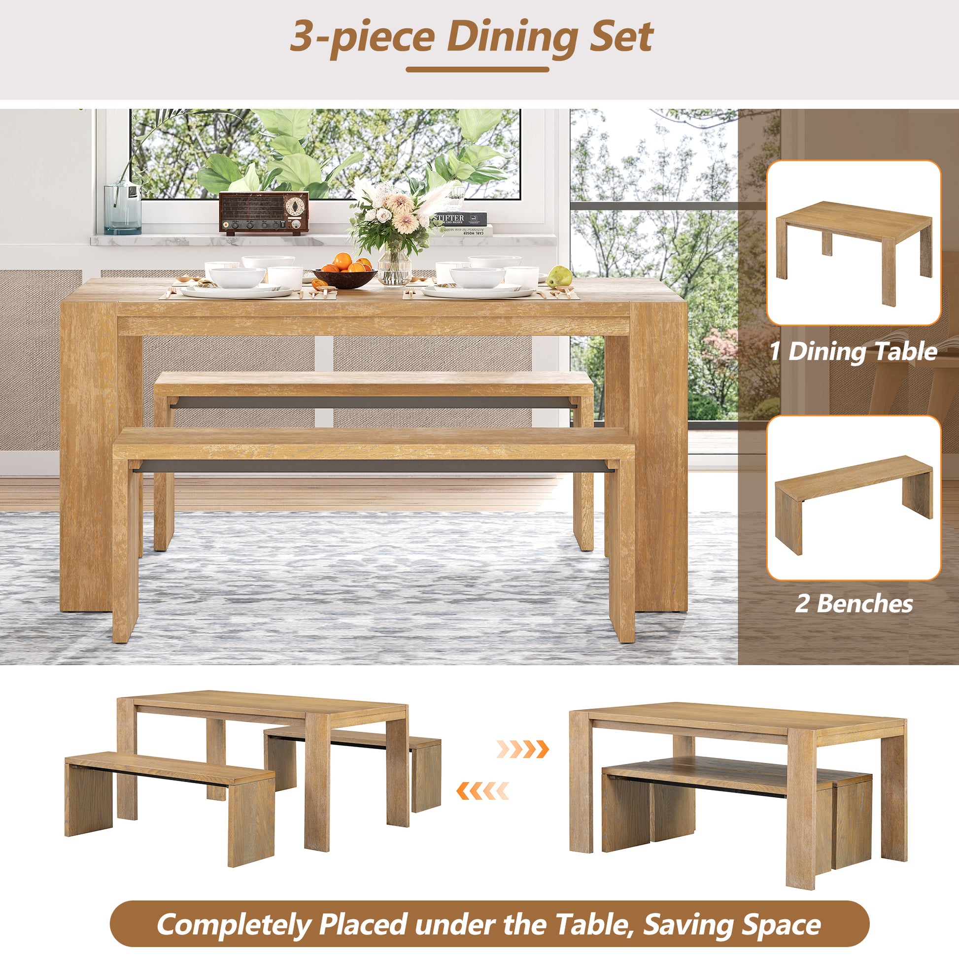 - 3-piece Dining Set: A dining table and two benches Included. The two benches can be completely placed under the table, increasing space utilization. The bench design replaces the traditional dining chairs, not only increasing the seating capacity, but also making the space around the dining table more open and transparent.