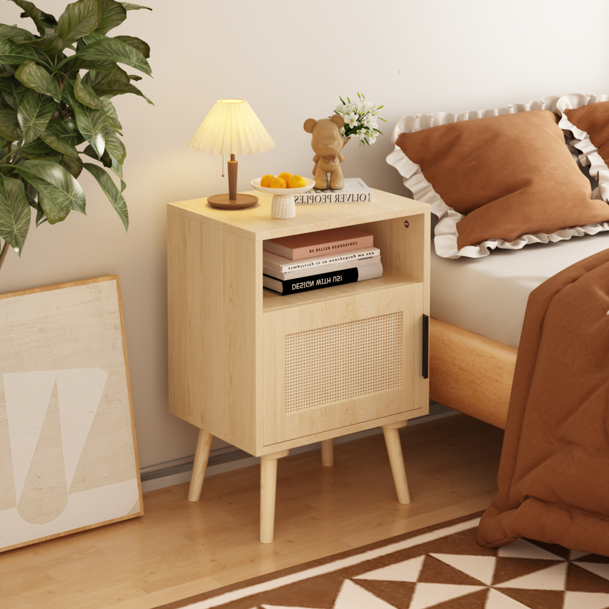 - A Spacious tabletop, rattan decor door, and open shelf can meet your storage needs. The natural wood nightstand is made of sturdy wood boards and high-quality beech legs. Its chic legs also bring a touch of visual appeal. It is reinforced by special screws to ensure its durability and stability, which can accompany you for many years.
