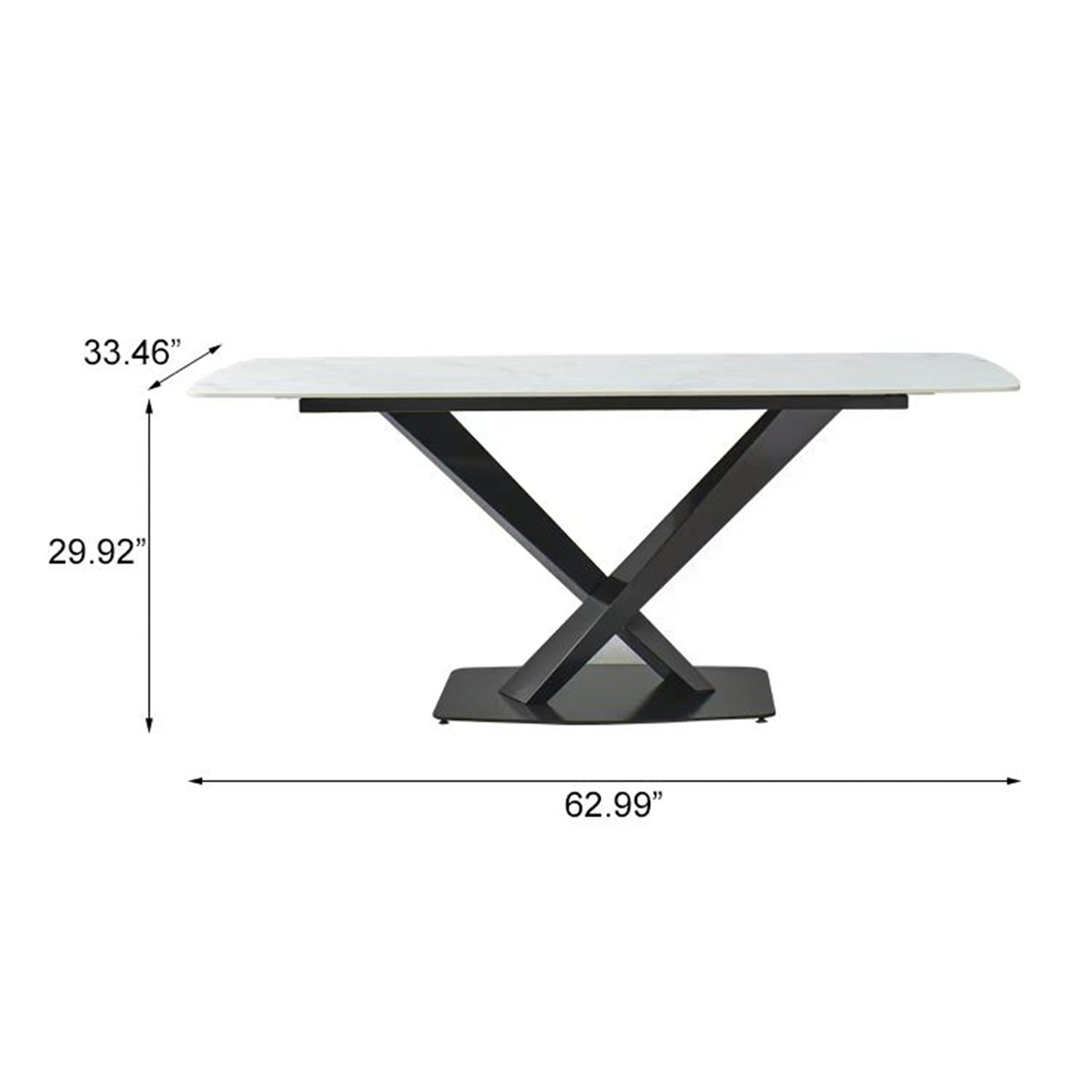 Product Name : Engineered stone dinning table ,Carrara white color , Modern Dinning table with solid Black Carbon Steel base 63 inch Material: Engineered stone + Carbon Steel frame Color: Carrara White table top +Black frame Style :Modern Dinning with X shapesolid Black base Capacity : 6-8 persons